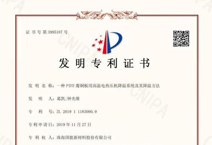 2020年9月18日,珠海kaiyun入口料股份有限公司获得由中华人民共和国国家知识产权局颁发、授权的《发明专利证书》。此项专利为公司本年度斩获的第三份专利发明授权。【发明简介】此次获得授权的发明名称为:一种PTFE覆铜板用高温电热压机降温系统及其...