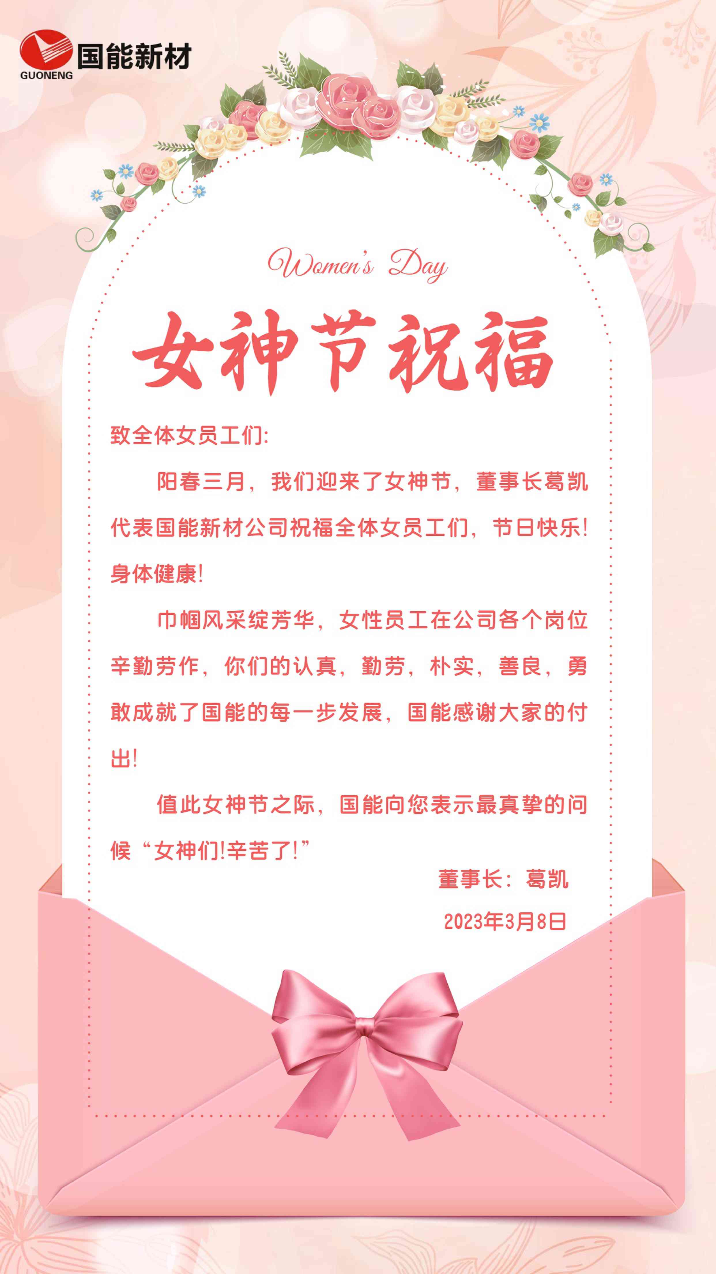 为庆祝三八国际妇女节,让全体女职工感受节日的温暖,kaiyun入口董事长葛凯写了寄语向所有女职工致以节日的祝贺及问候。