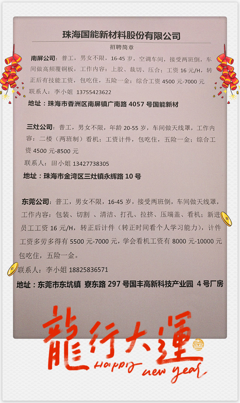 龙年开工大吉,招聘正当时!请大家多多介绍亲友入职,支援公司生产。我们诚邀您加入国能充满活力的团队,与优秀团队并肩作战,共赴新征程。公司提供广阔发展空间与优厚待遇。如果您怀揣梦想,勇往直前,请立即联系我们,开启龙年新征程!期待与您共创辉煌!