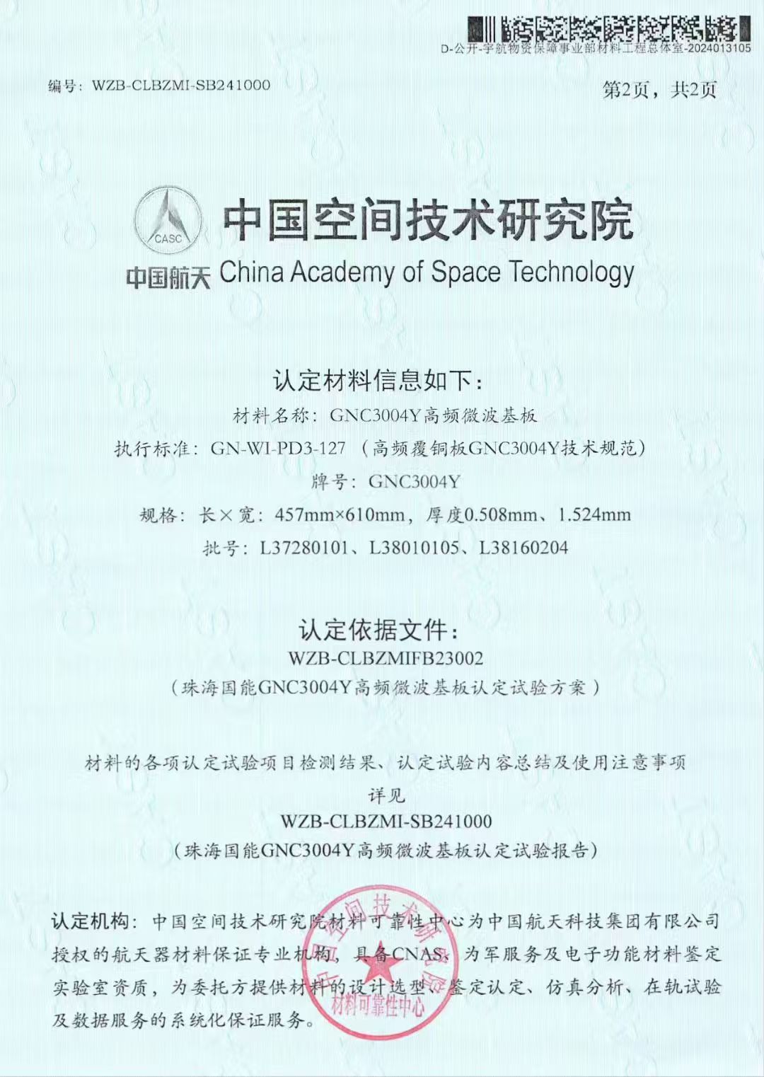 【重磅喜讯】GNC3004Y板材获中国空间技术研究院权威认证!